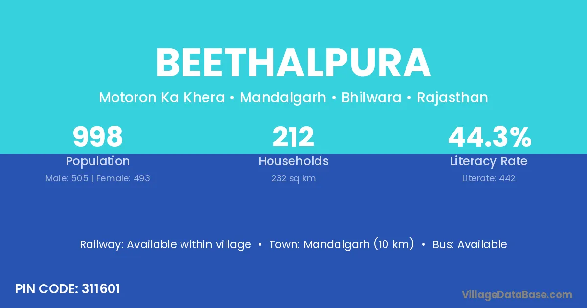 Mandalgarh (10 km) is the nearest town to Beethalpura village for major economic activities and is located approximately 10 km away.