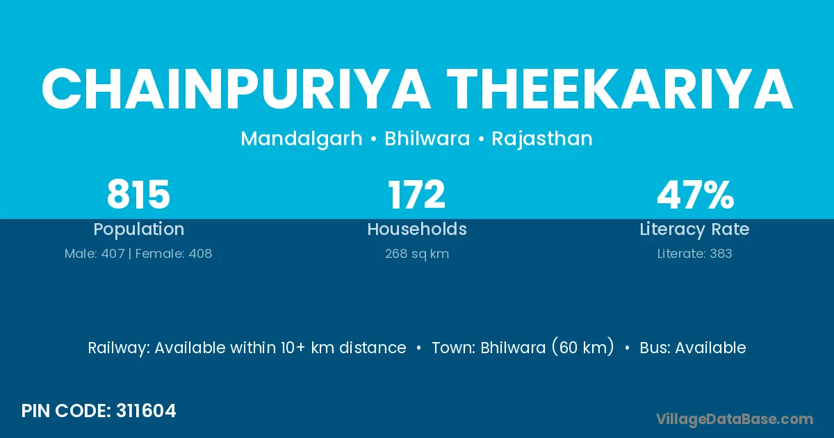 Bhilwara (60 km) is the nearest town to Chainpuriya Theekariya village for major economic activities and is located approximately 60 km away.