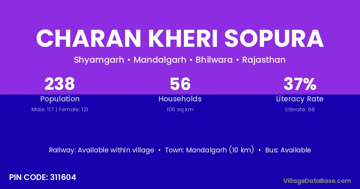 Mandalgarh (10 km) is the nearest town to Charan Kheri Sopura village for major economic activities and is located approximately 10 km away.