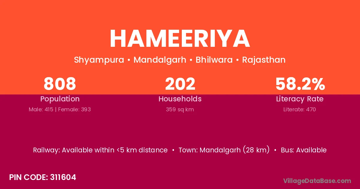 Mandalgarh (28 km) is the nearest town to Hameeriya village for major economic activities and is located approximately 28 km away.