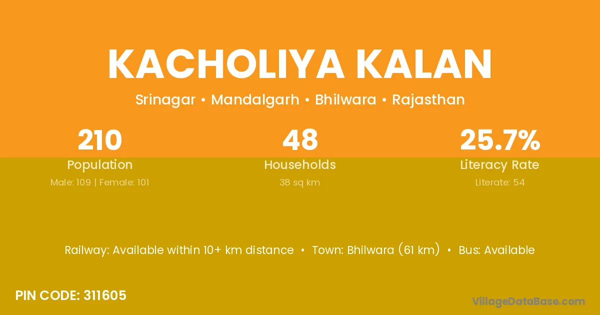 Bhilwara (61 km) is the nearest town to Kacholiya Kalan village for major economic activities and is located approximately 61 km away.