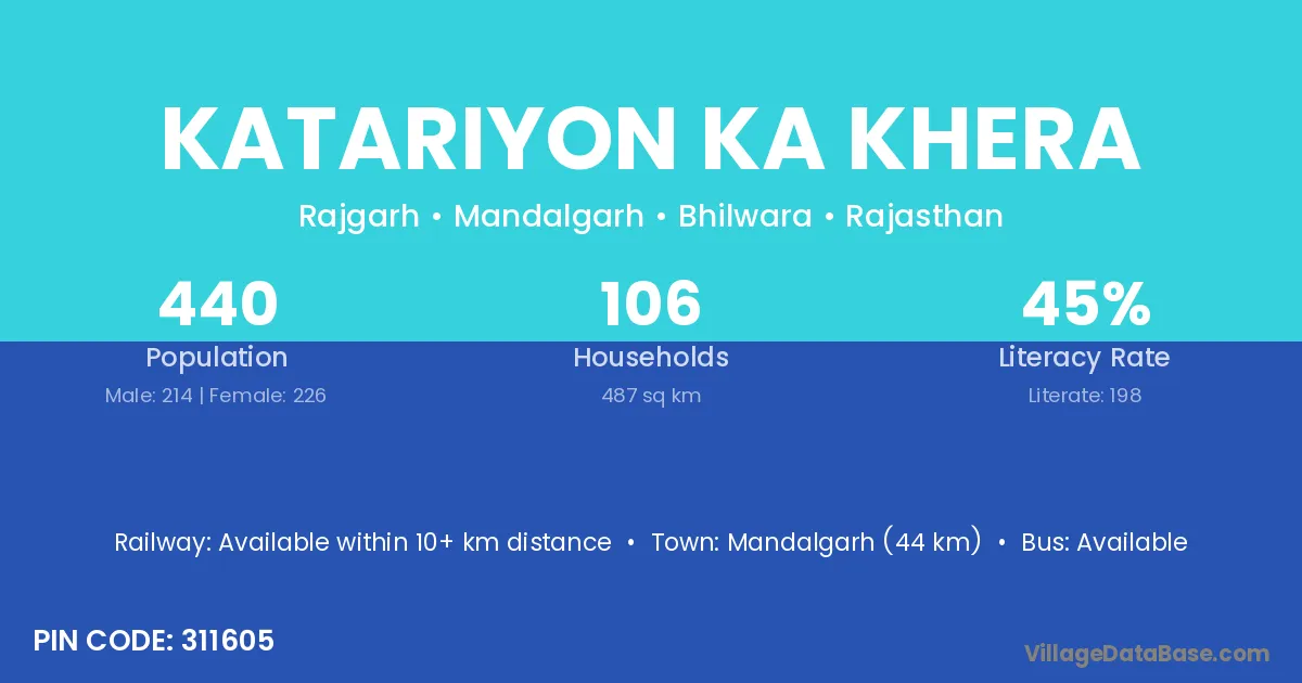 Mandalgarh (44 km) is the nearest town to Katariyon Ka Khera village for major economic activities and is located approximately 44 km away.