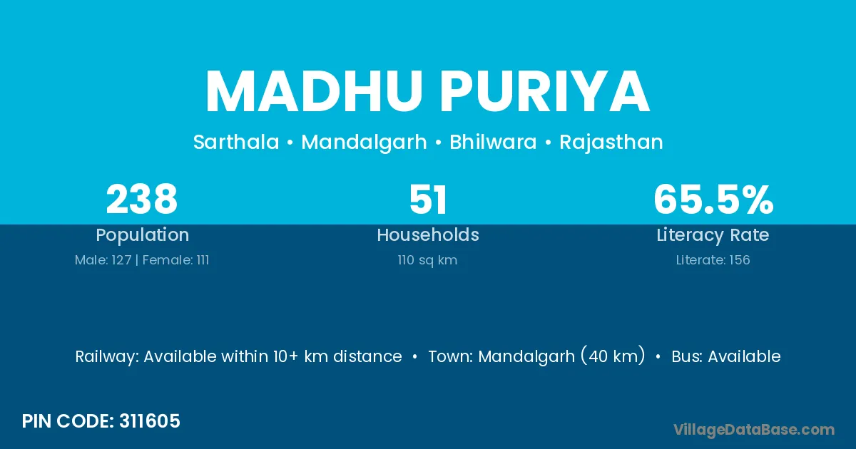 Mandalgarh (40 km) is the nearest town to Madhu Puriya village for major economic activities and is located approximately 40 km away.