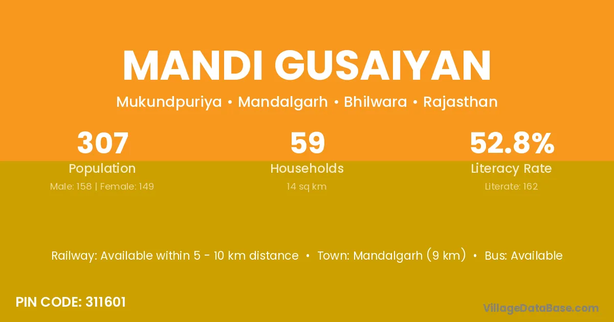 Mandalgarh (9 km) is the nearest town to Mandi Gusaiyan village for major economic activities and is located approximately 9 km away.