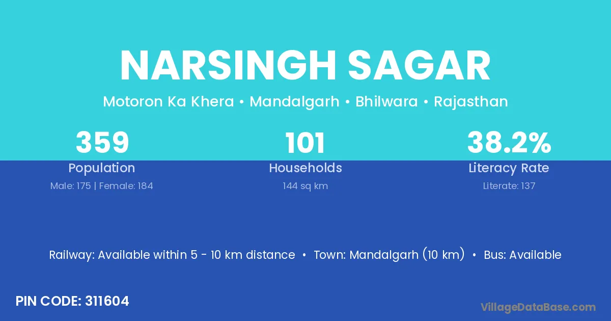 Mandalgarh (10 km) is the nearest town to Narsingh Sagar village for major economic activities and is located approximately 10 km away.