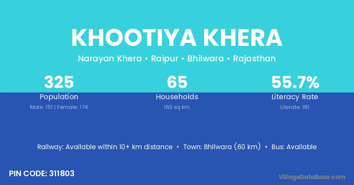 Bhilwara (60 km) is the nearest town to Khootiya Khera village for major economic activities and is located approximately 60 km away.