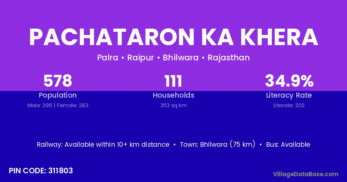 Pachataron Ka Khera village has a total population of 578 people, of which 295 are males and 283 are females.