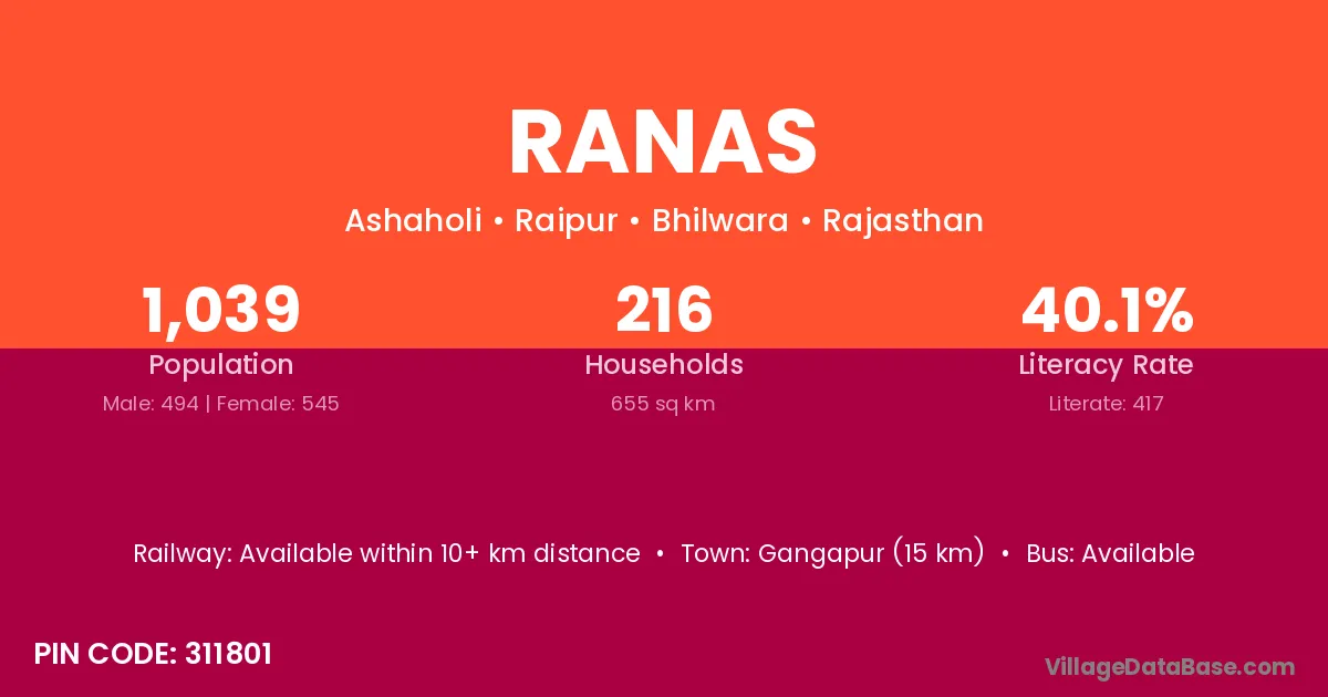 Ranas village has a total population of 1,039 people, of which 494 are males and 545 are females.