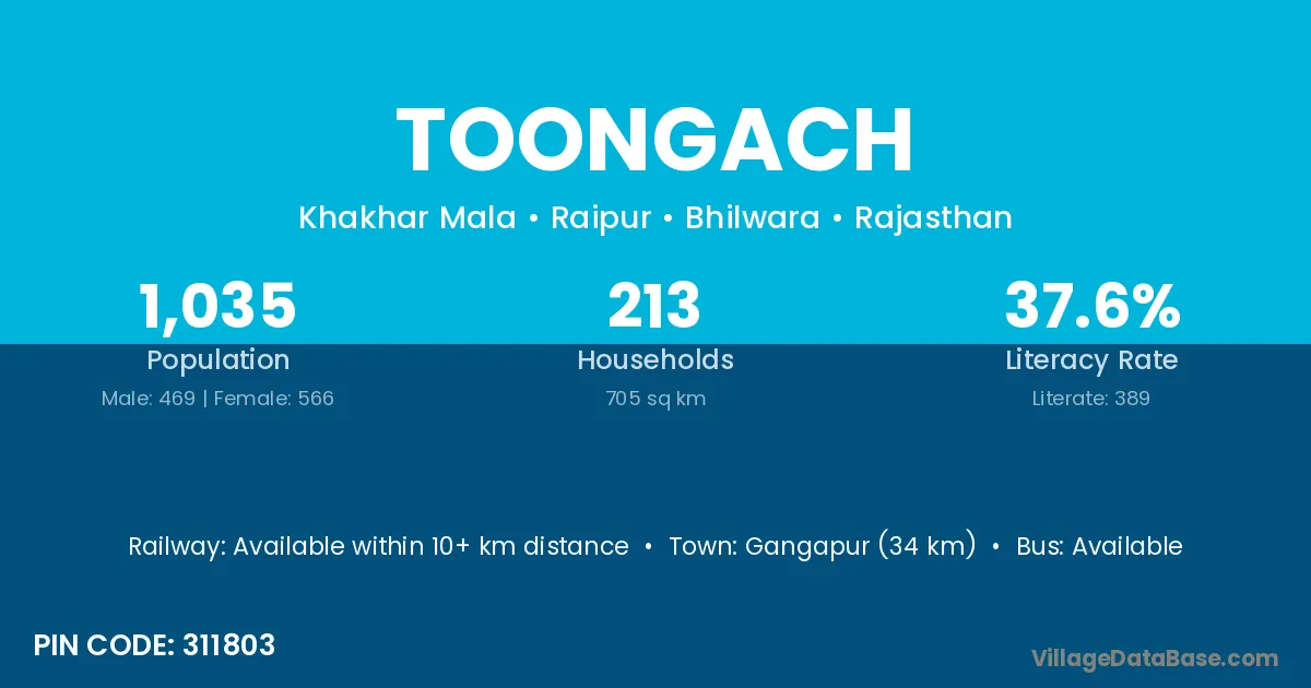 Gangapur (34 km) is the nearest town to Toongach village for major economic activities and is located approximately 34 km away.