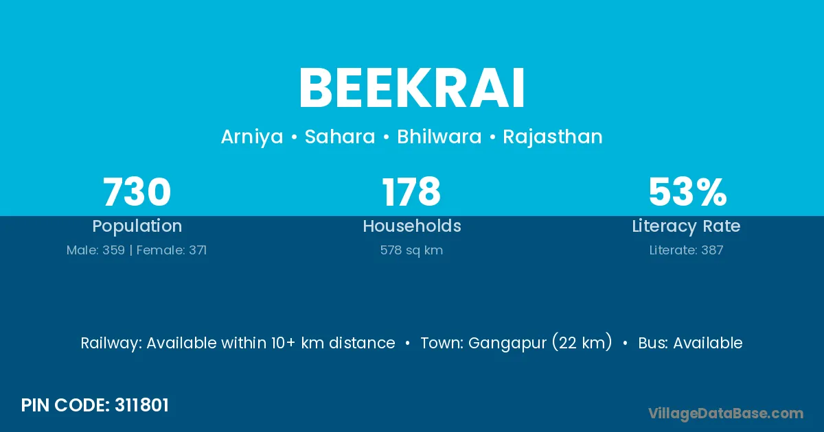 Gangapur (22 km) is the nearest town to Beekrai village for major economic activities and is located approximately 22 km away.