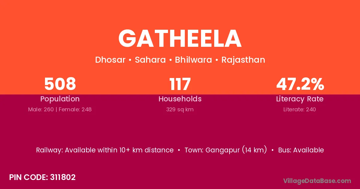 Gangapur (14 km) is the nearest town to Gatheela village for major economic activities and is located approximately 14 km away.