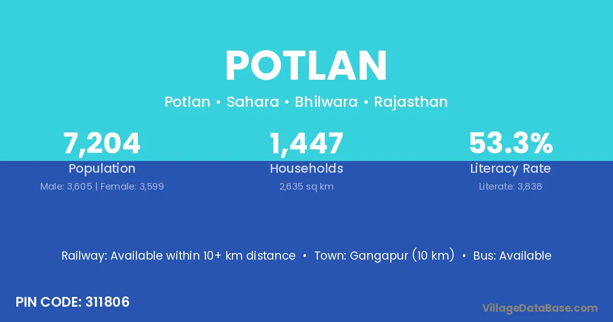 Potlan village has a total population of 7,204 people, of which 3,605 are males and 3,599 are females.