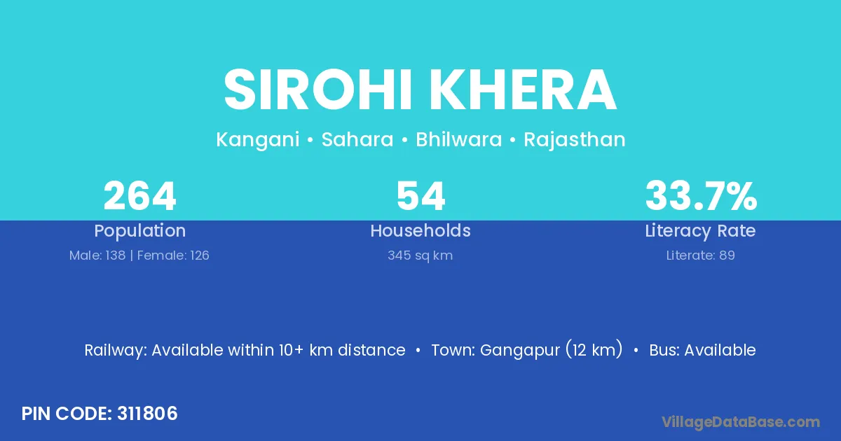 Gangapur (12 km) is the nearest town to Sirohi Khera village for major economic activities and is located approximately 12 km away.