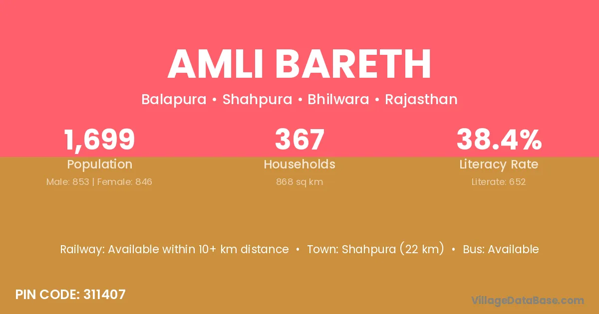 Shahpura (22 km) is the nearest town to Amli Bareth village for major economic activities and is located approximately 22 km away.
