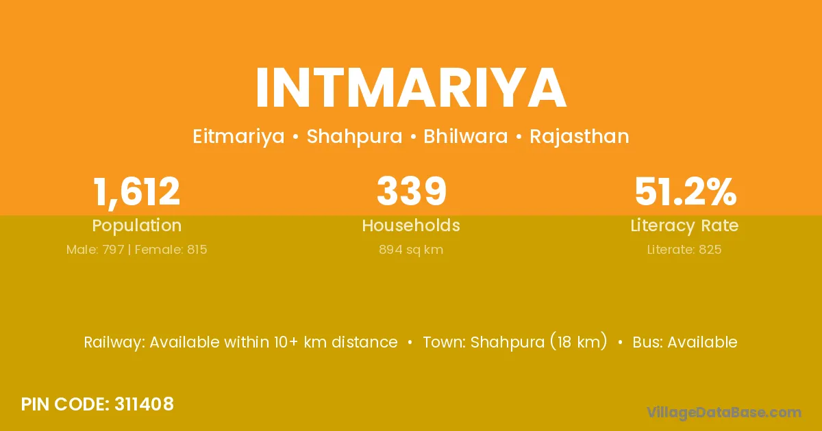 Shahpura (18 km) is the nearest town to Intmariya village for major economic activities and is located approximately 18 km away.
