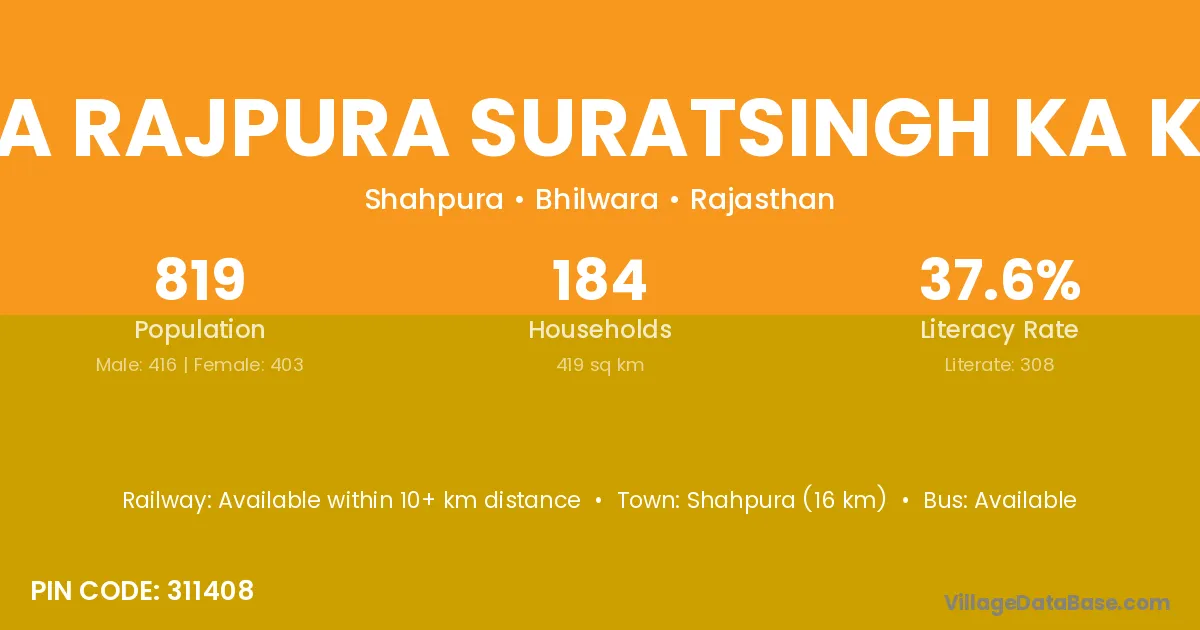 Khera Rajpura Suratsingh Ka Khera village has a total population of 819 people, of which 416 are males and 403 are females.