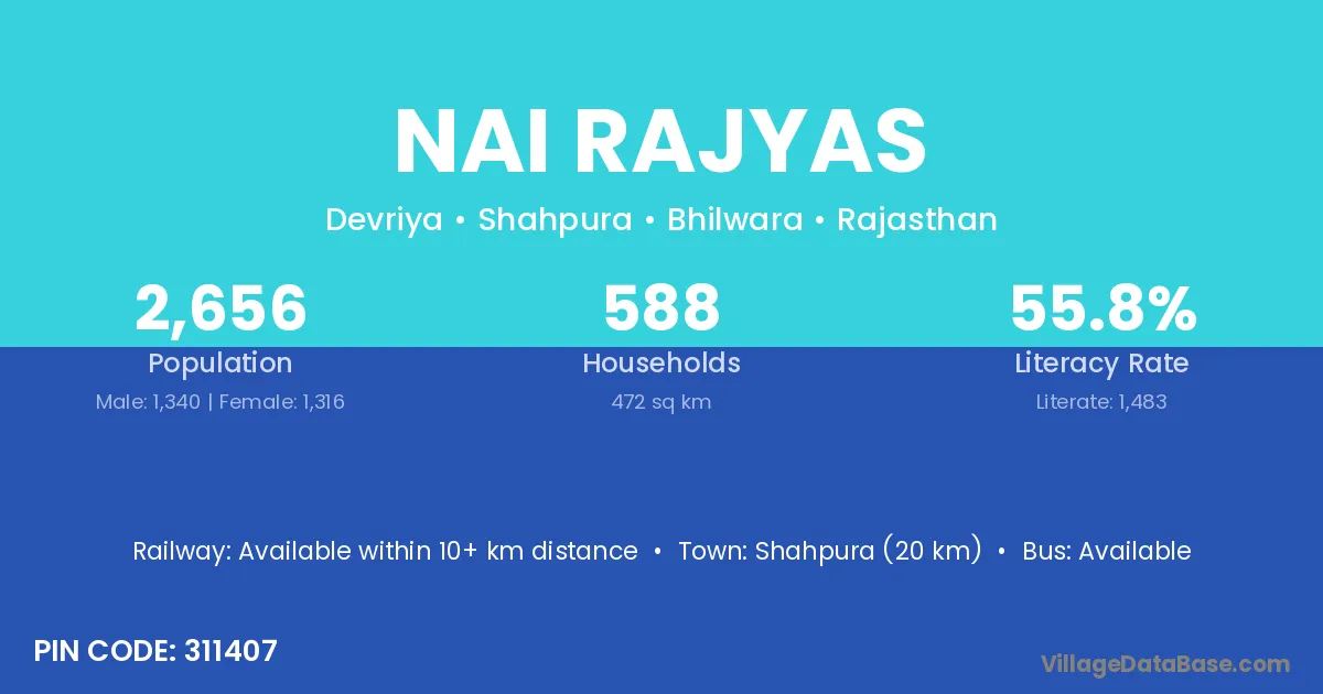 Shahpura (20 km) is the nearest town to Nai Rajyas village for major economic activities and is located approximately 20 km away.