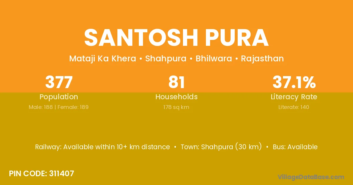 Shahpura (30 km) is the nearest town to Santosh Pura village for major economic activities and is located approximately 30 km away.