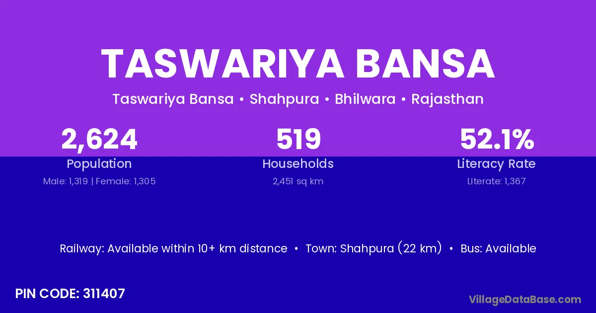 Shahpura (22 km) is the nearest town to Taswariya Bansa village for major economic activities and is located approximately 22 km away.