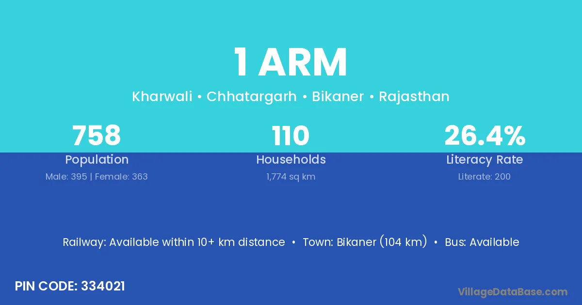 Bikaner (104 km) is the nearest town to 1 Arm village for major economic activities and is located approximately 104 km away.