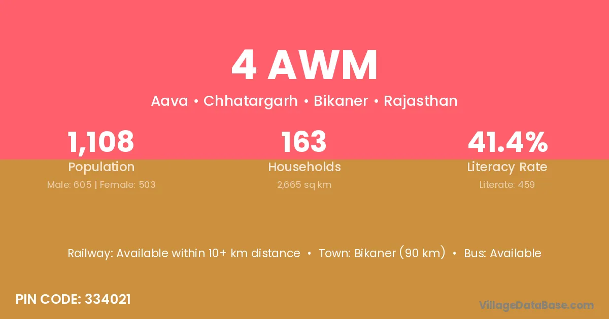Bikaner (90 km) is the nearest town to 4 Awm village for major economic activities and is located approximately 90 km away.