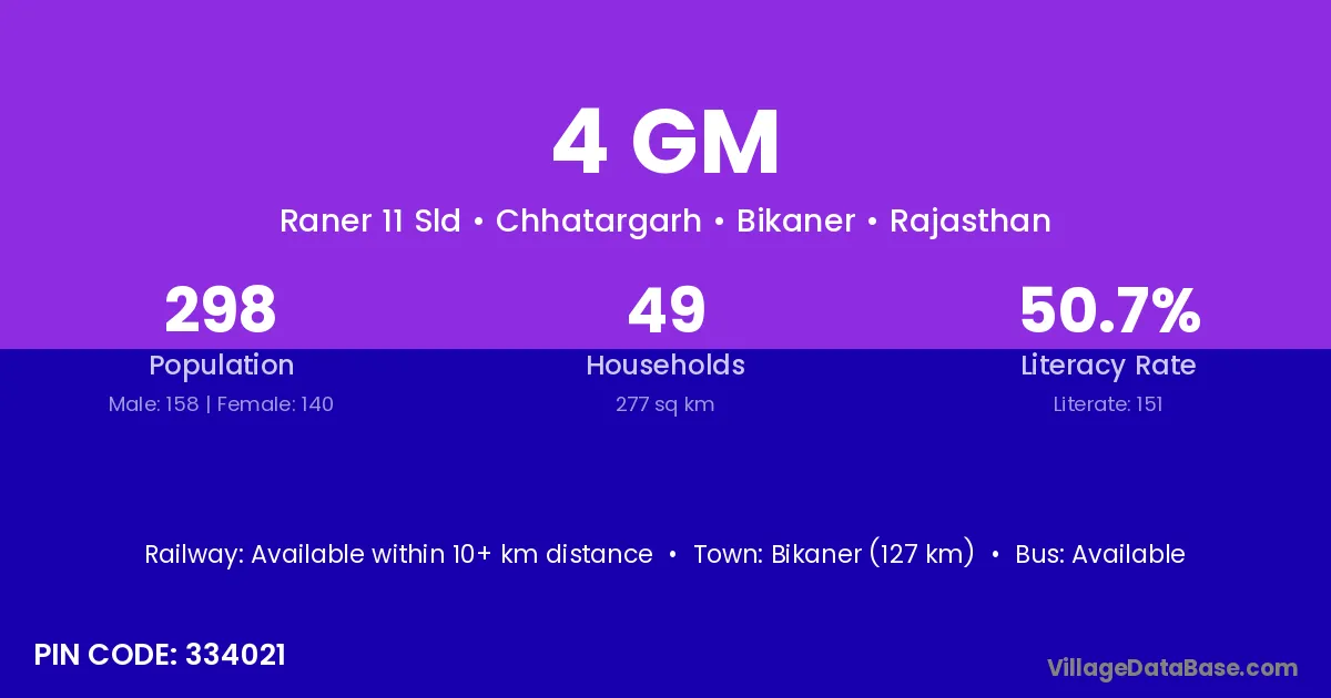 Bikaner (127 km) is the nearest town to 4 Gm village for major economic activities and is located approximately 127 km away.