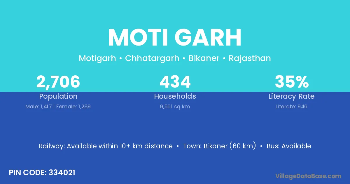 Bikaner (60 km) is the nearest town to Moti Garh village for major economic activities and is located approximately 60 km away.