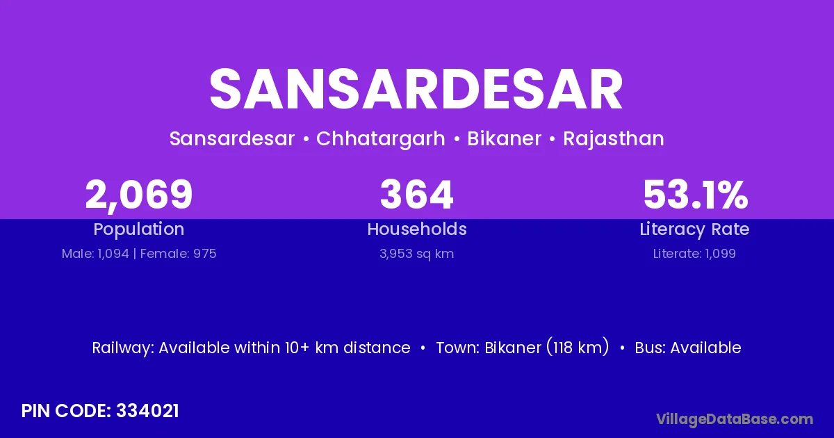 According to Census 2011 information, the village code of Sansardesar village is 334021.