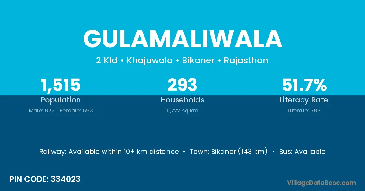 Bikaner (143 km) is the nearest town to Gulamaliwala village for major economic activities and is located approximately 143 km away.