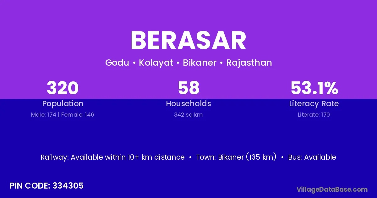 Bikaner (135 km) is the nearest town to Berasar village for major economic activities and is located approximately 135 km away.