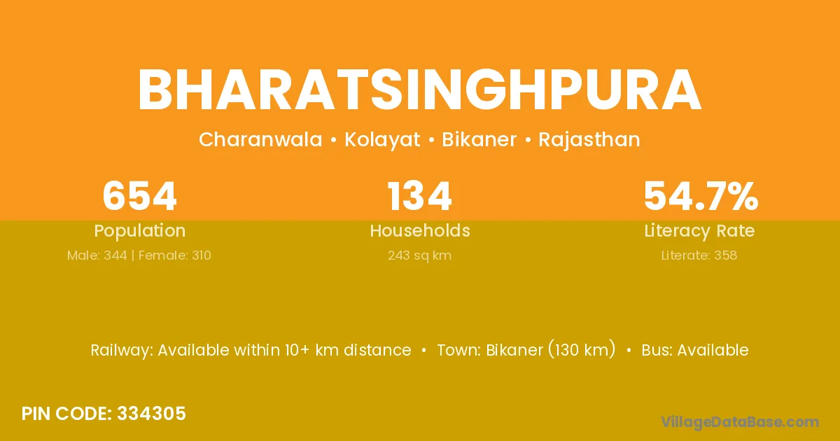 Bikaner (130 km) is the nearest town to Bharatsinghpura village for major economic activities and is located approximately 130 km away.