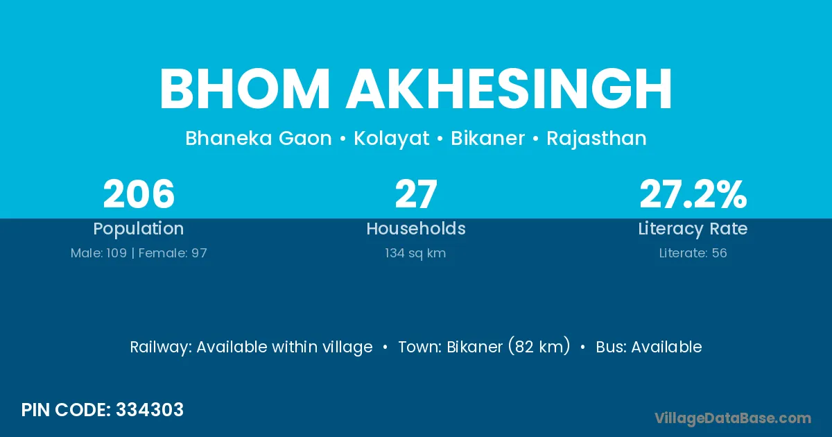 Bikaner (82 km) is the nearest town to Bhom Akhesingh village for major economic activities and is located approximately 82 km away.