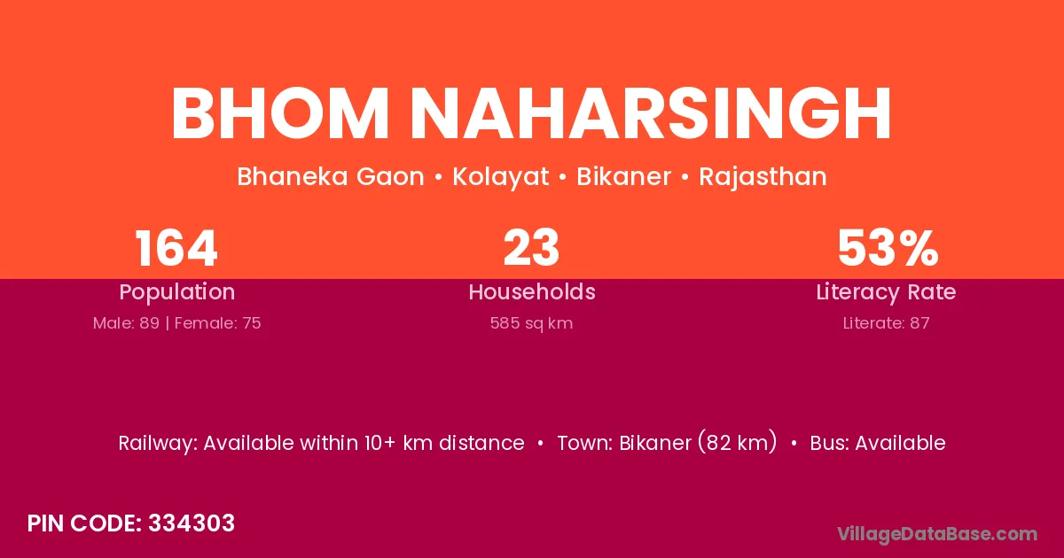 Bikaner (82 km) is the nearest town to Bhom Naharsingh village for major economic activities and is located approximately 82 km away.