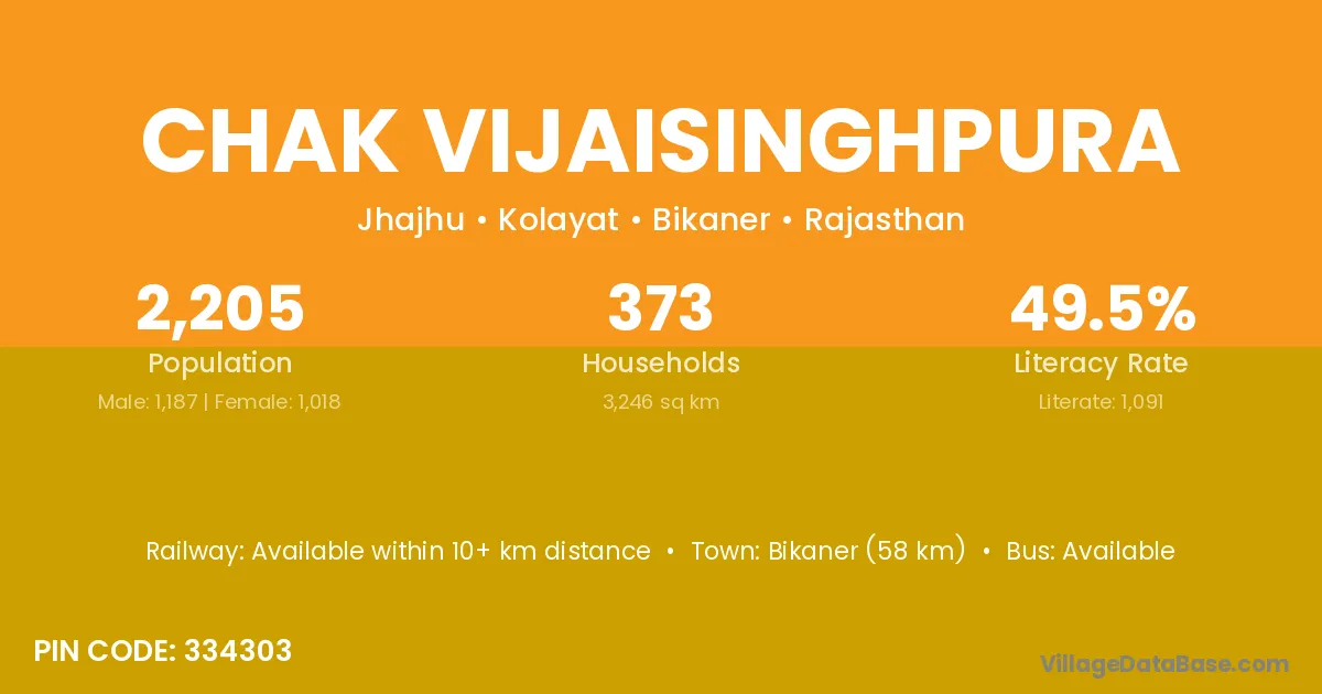 Bikaner (58 km) is the nearest town to Chak Vijaisinghpura village for major economic activities and is located approximately 58 km away.