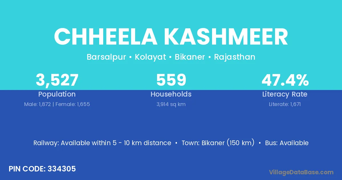 Bikaner (150 km) is the nearest town to Chheela Kashmeer village for major economic activities and is located approximately 150 km away.