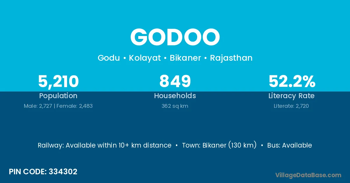 Bikaner (130 km) is the nearest town to Godoo village for major economic activities and is located approximately 130 km away.