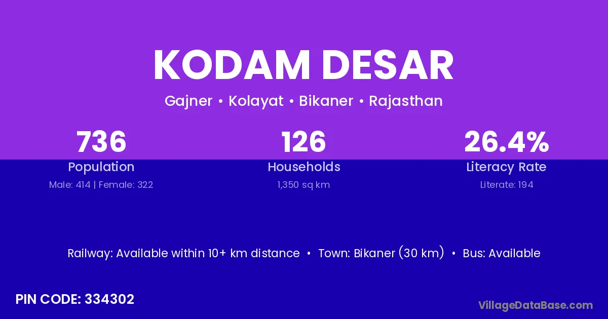 Bikaner (30 km) is the nearest town to Kodam Desar village for major economic activities and is located approximately 30 km away.