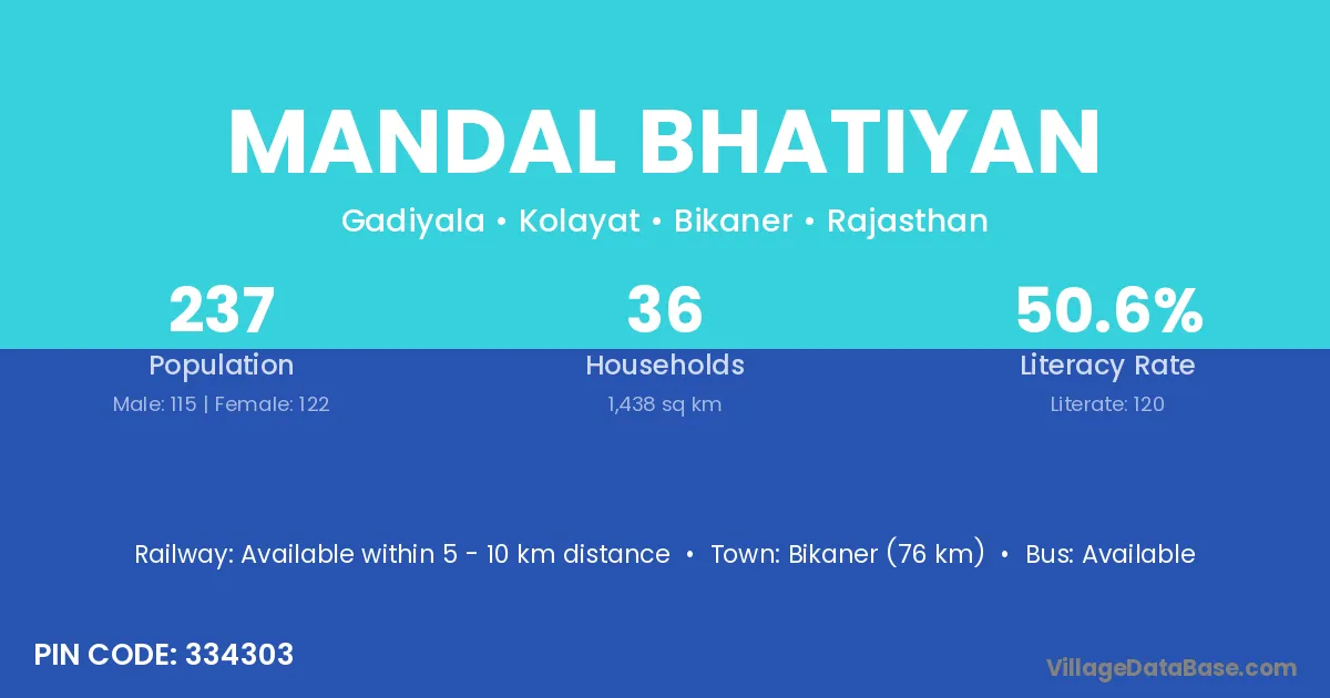 Bikaner (76 km) is the nearest town to Mandal Bhatiyan village for major economic activities and is located approximately 76 km away.