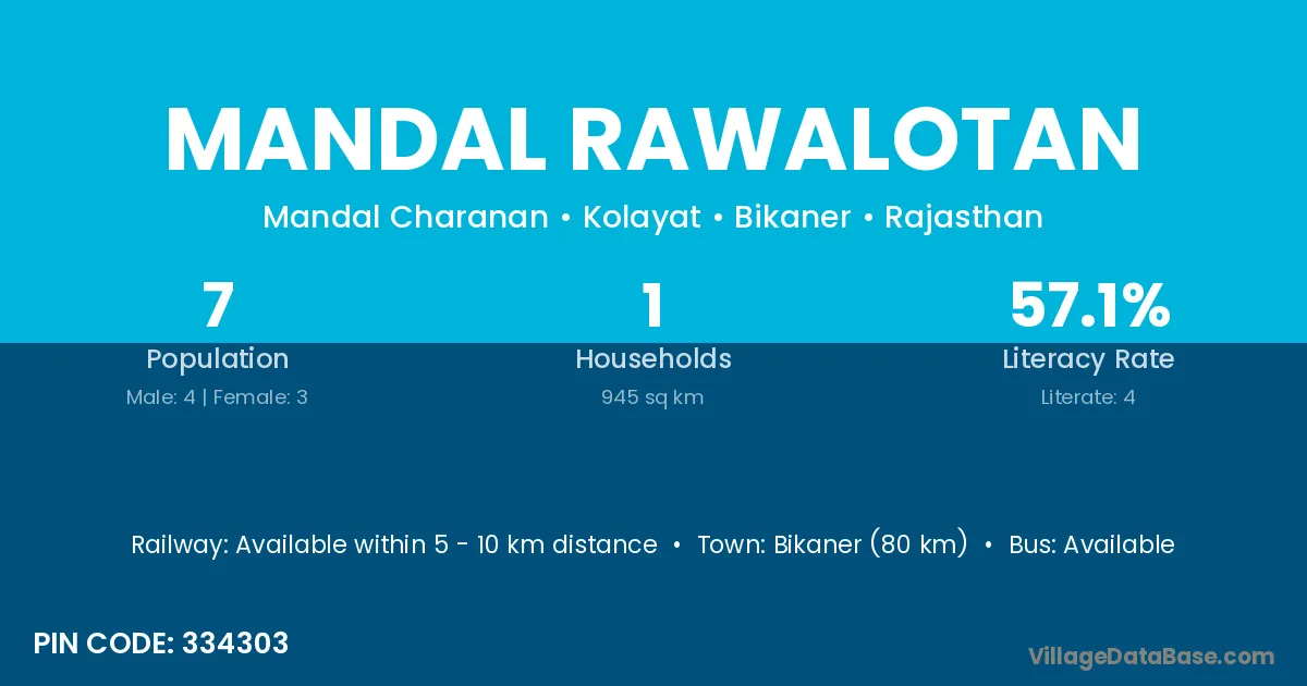 Bikaner (80 km) is the nearest town to Mandal Rawalotan village for major economic activities and is located approximately 80 km away.
