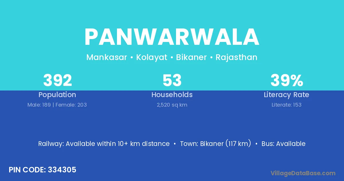 Bikaner (117 km) is the nearest town to Panwarwala village for major economic activities and is located approximately 117 km away.