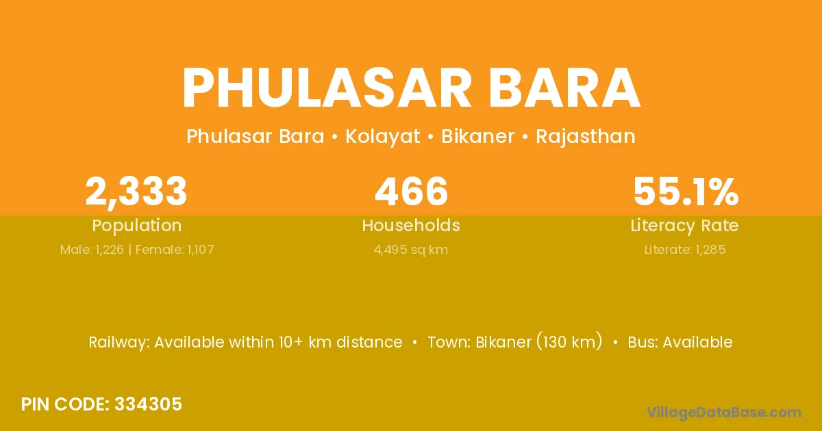 Bikaner (130 km) is the nearest town to Phulasar Bara village for major economic activities and is located approximately 130 km away.