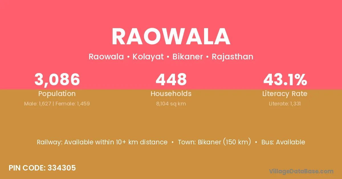 Bikaner (150 km) is the nearest town to Raowala village for major economic activities and is located approximately 150 km away.