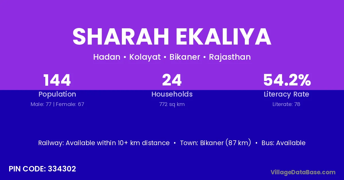 Bikaner (87 km) is the nearest town to Sharah Ekaliya village for major economic activities and is located approximately 87 km away.