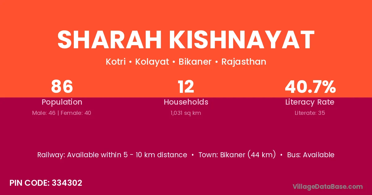 Bikaner (44 km) is the nearest town to Sharah Kishnayat village for major economic activities and is located approximately 44 km away.