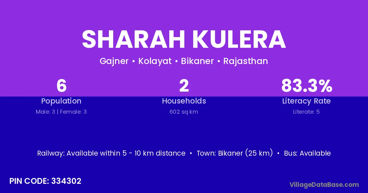 Bikaner (25 km) is the nearest town to Sharah Kulera village for major economic activities and is located approximately 25 km away.