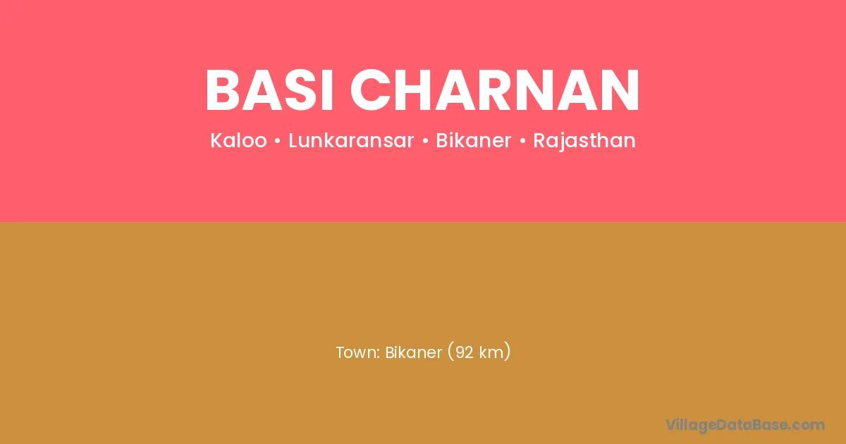 Bikaner (92 km) is the nearest town to Basi Charnan village for major economic activities and is located approximately 92 km away.