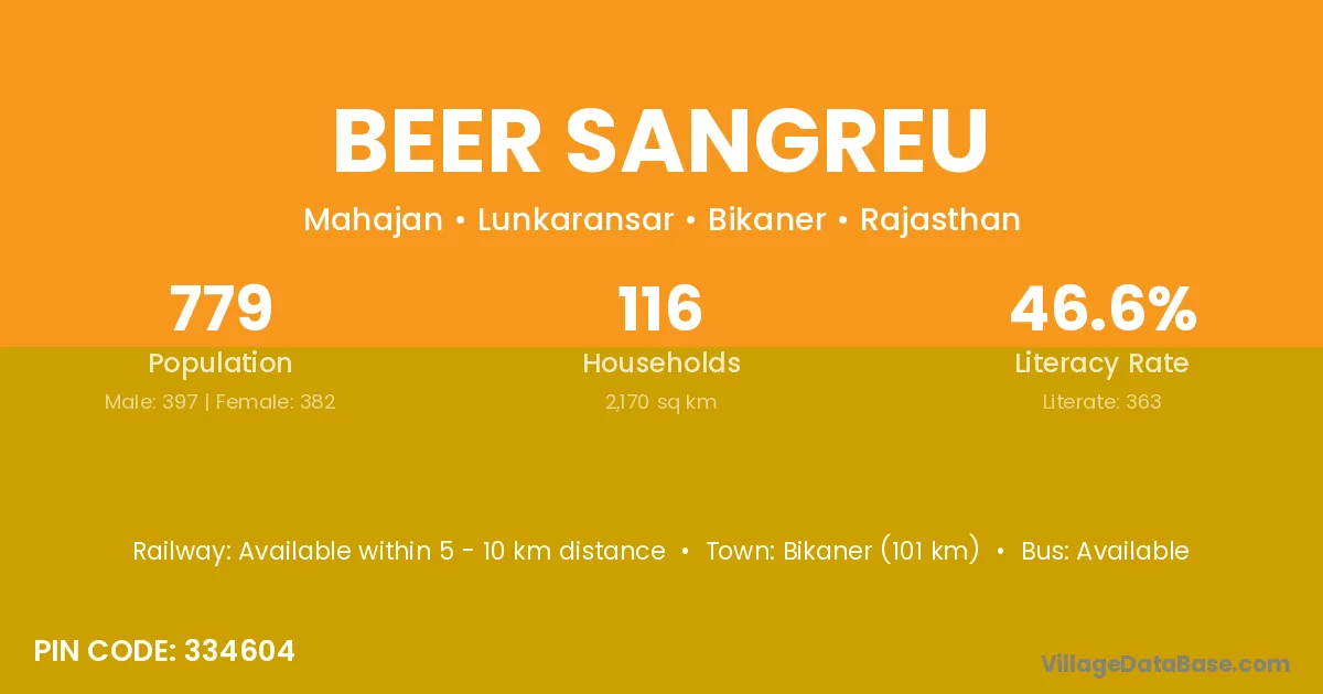 Bikaner (101 km) is the nearest town to Beer Sangreu village for major economic activities and is located approximately 101 km away.