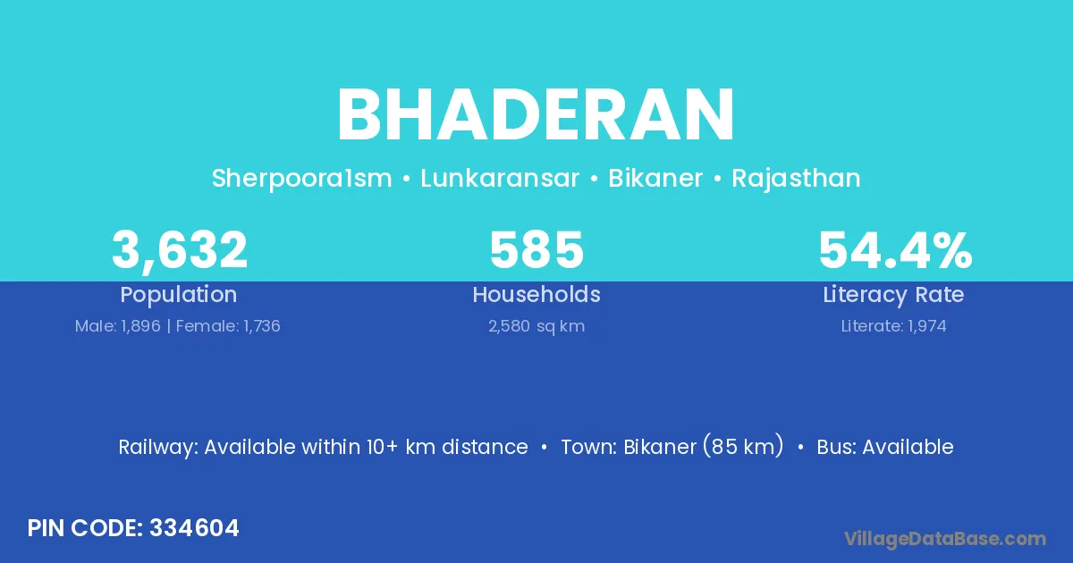 Bikaner (85 km) is the nearest town to Bhaderan village for major economic activities and is located approximately 85 km away.