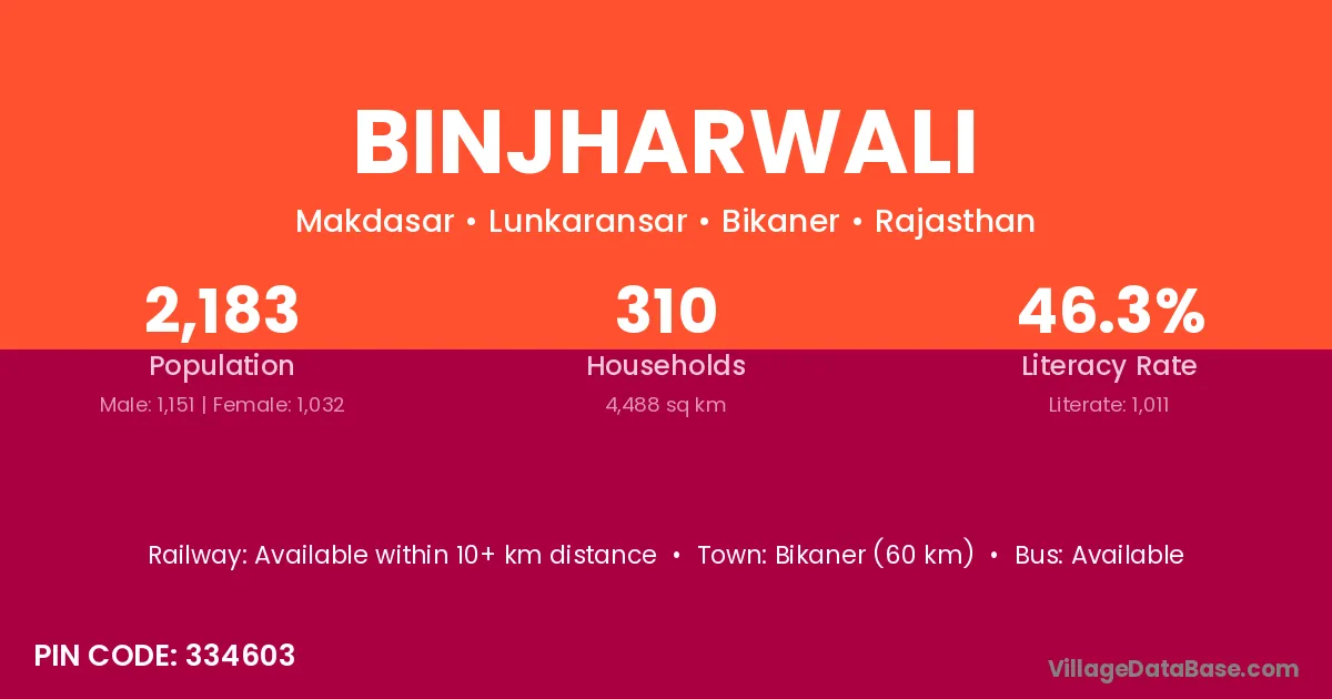 Bikaner (60 km) is the nearest town to Binjharwali village for major economic activities and is located approximately 60 km away.