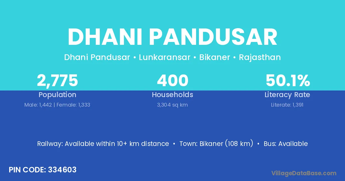 Bikaner (108 km) is the nearest town to Dhani Pandusar village for major economic activities and is located approximately 108 km away.